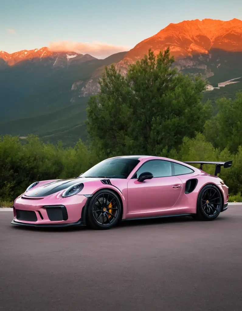A vibrant pink Porsche 911 GT3 RS stands proudly against a breath-taking backdrop of snow-capped mountains and a fiery sunset. This striking contrast between the car’s bold colour and the natural beauty of the surrounding landscape creates an awe-inspiring image. The GT3 RS, a track-focused variant of the iconic 911, is renowned for its exceptional performance and aggressive styling.