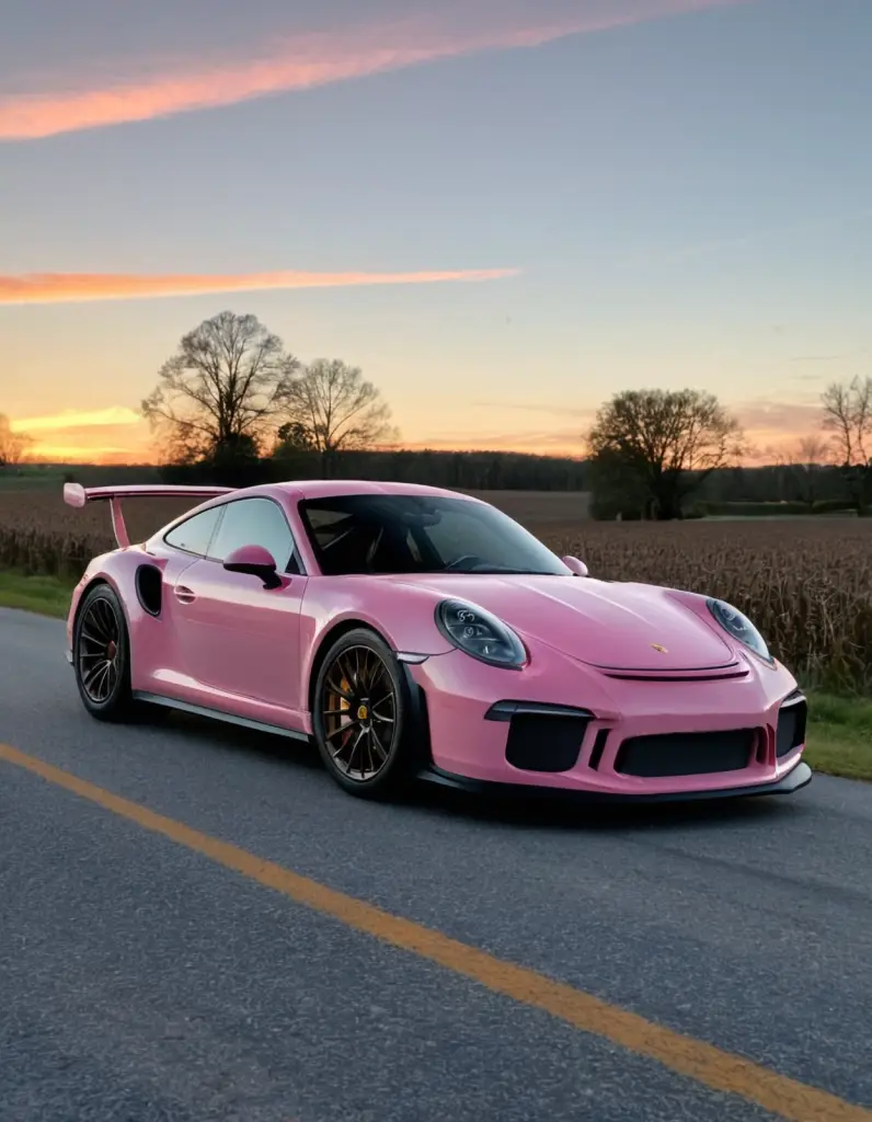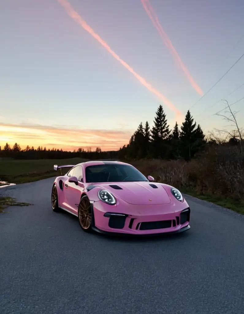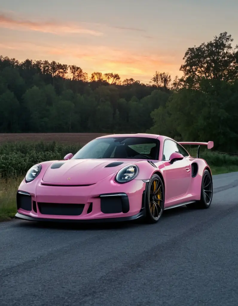 A breathtaking Porsche 911 GT3 RS, painted in a striking shade of pink, dominates the foreground. The car’s sleek lines and aggressive aerodynamics are accentuated by the vibrant color, creating a visually stunning contrast against the serene backdrop. The setting sun casts a warm, golden glow over the landscape, highlighting the car’s intricate details and reflective surfaces. Rolling hills, lush greenery, and a winding road complete the picturesque scene, inviting the viewer to imagine the thrill of driving this high-performance machine through such idyllic surroundings.