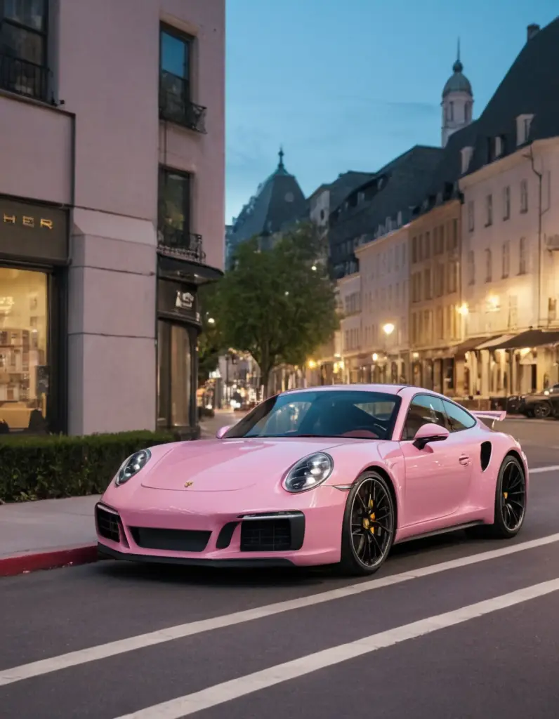 The hot pink Porsche 911 Carrera S gleams under the warm glow of the streetlights, its sleek lines contrasting beautifully with the classic European architecture. The car’s vibrant color adds a playful touch to its sporty design, while the backdrop of the historic buildings creates a captivating juxtaposition of old and new. With its powerful engine, advanced technology, and luxurious interior, the Porsche is not only a stunning visual spectacle but also a driving experience like no other. As it sits parked on the cobblestone street, it commands attention, a symbol of both power and style.